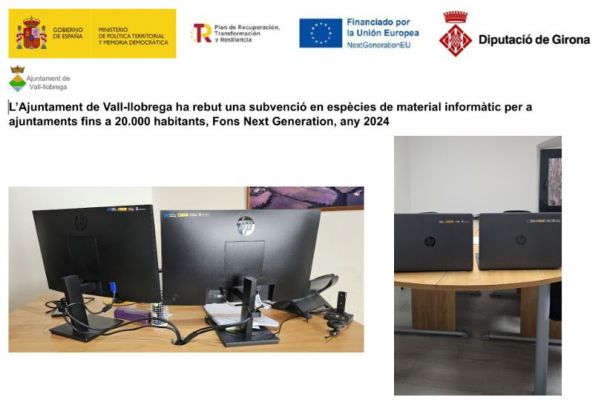 La Diputació de Girona ha concedit a l’Ajuntament de Vall-llobrega una subvenció en espècies de material informàtic amb fons Next Generation per a l’any 2024 per import de 1.477,14 €