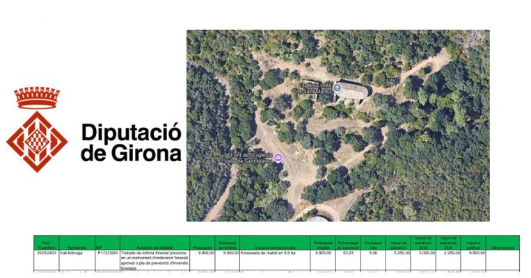 La Diputació de Girona ha concedit a l'Ajuntament de Vall-llobrega una subvenció per a actuacions en matèria forestal i de prevenció d'incendis forestals L1 2025-2026 per import de 5.250,00 € que s'ha destinat a estassada de matoll a l'Església Vella de Sant Mateu.